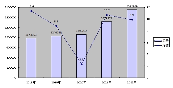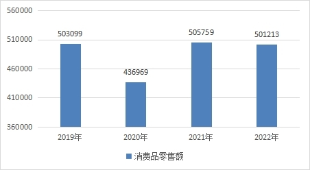 2022年批發和零售業商品銷售額完成981327萬元,其中批發業為354932萬元,比上年增長3.3%,限額以上商品銷售額為82773萬元,比上年下降31.2%,零售業銷售額為626395萬元,比上年增長4.0%,限額以上零售額為247839萬元,比上年增長15.7%。