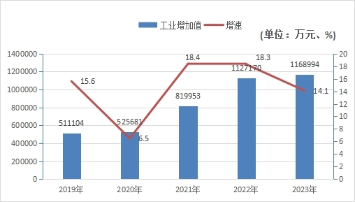 2023年,全區全部工業增加值完成1168994萬元,比上年增長14.1%,92家規模以上工業企業增加值比上年增長39.3%,實現營業收入2609748萬元,實現利潤總額55084萬元,實現稅金及附加24052萬元。全區全部建筑業實現增加值121853萬元,比上年增長12.9%。