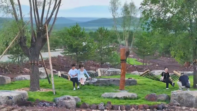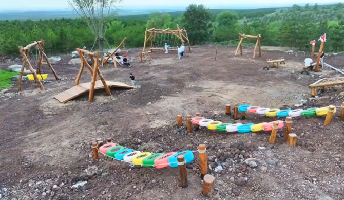游客停好車后,沿著云州街口火山游步道拾級而上,會發現這條游步道巧妙運用火山石打造而成,一路延伸至金山咖啡。沿途設置的蕩秋千、滑索道、蹺蹺板等游玩區,為游客增添了豐富的游玩樂趣,滿足了不同年齡段游客的娛樂需求。